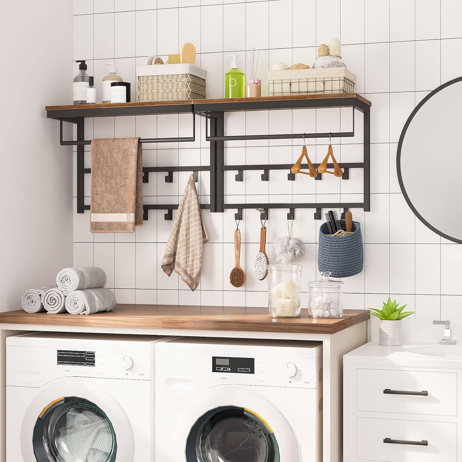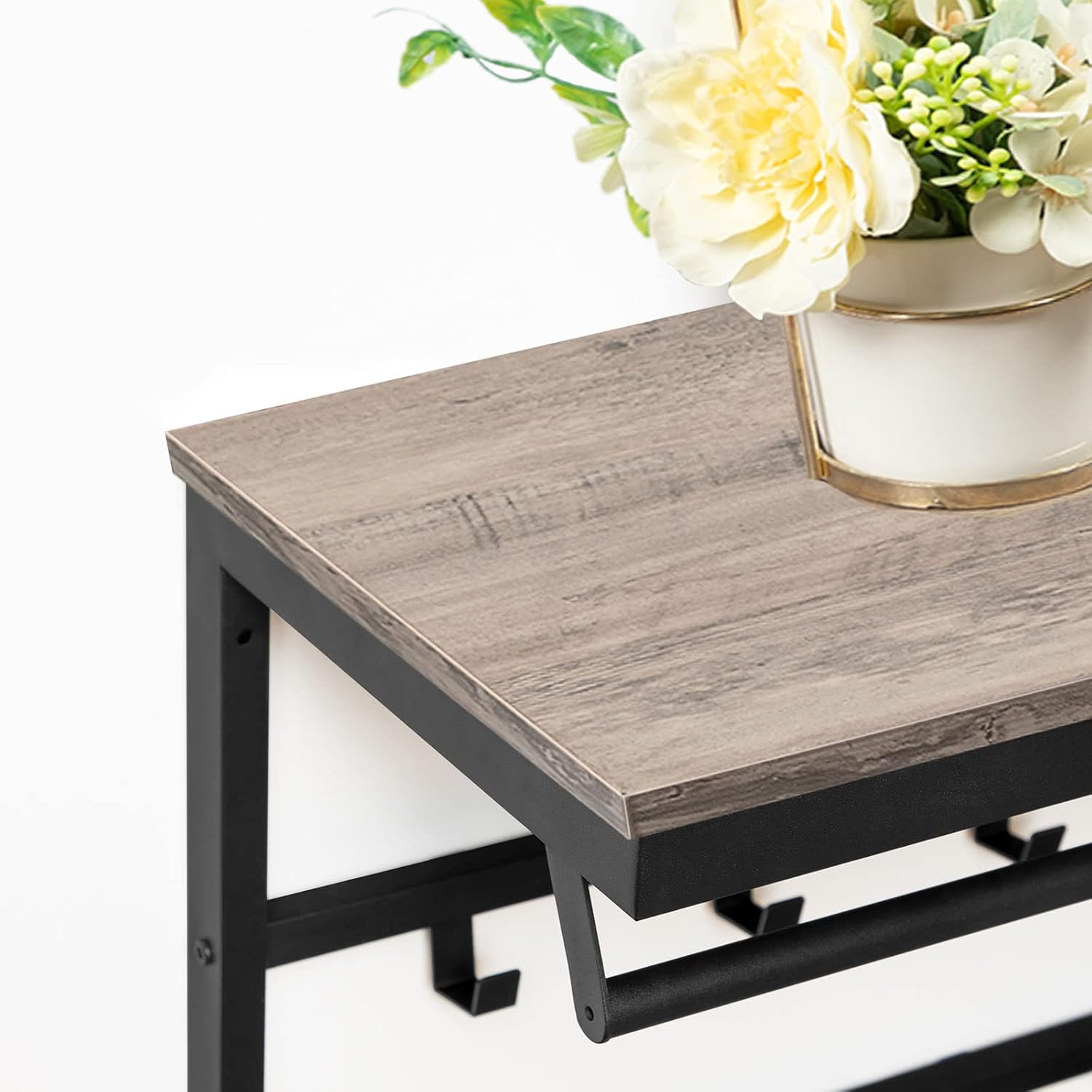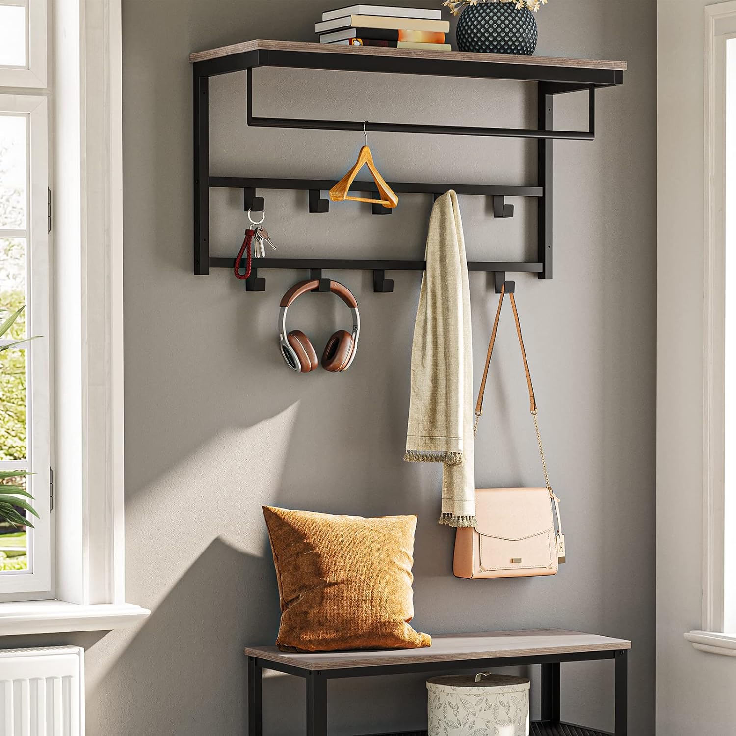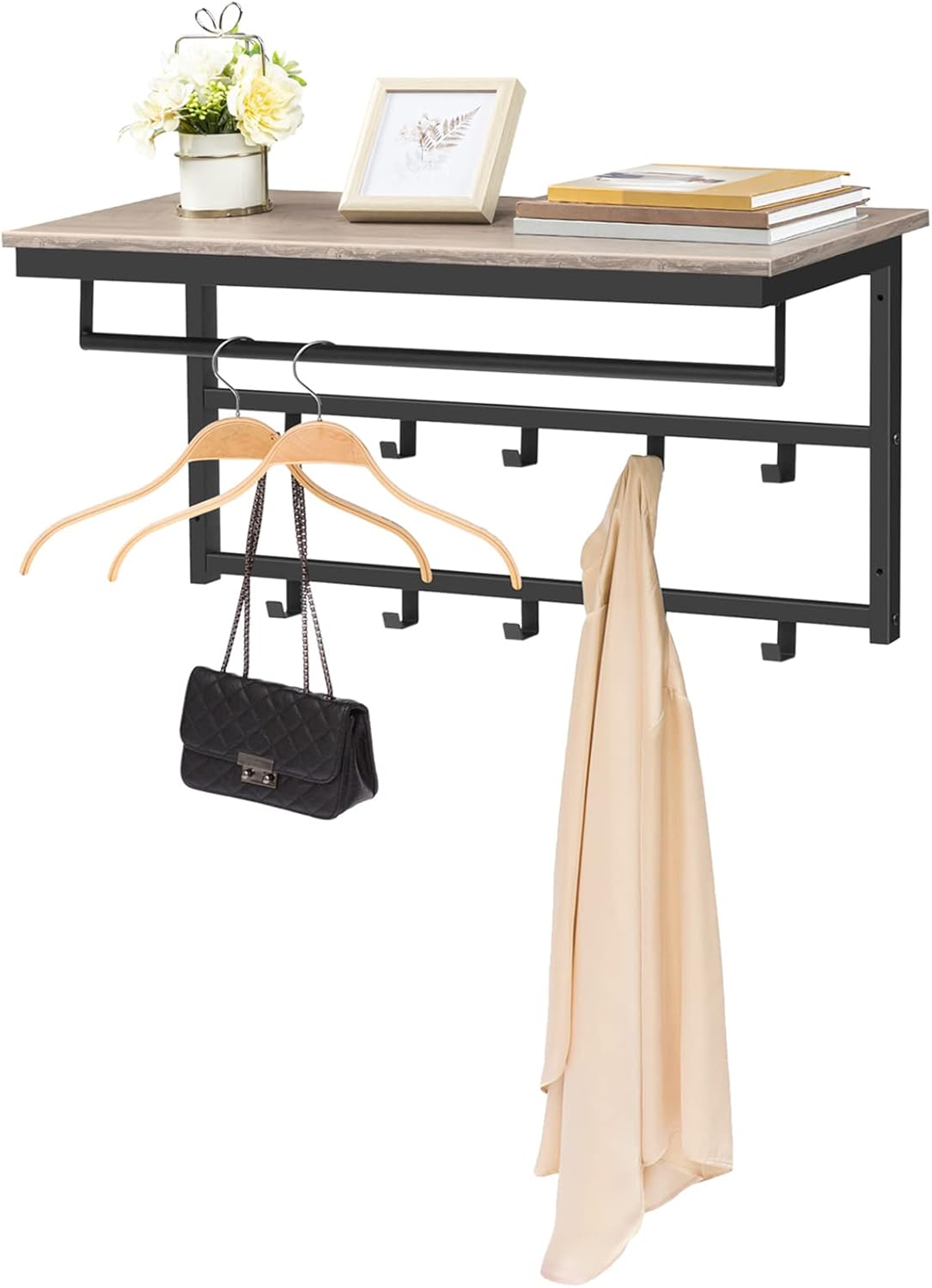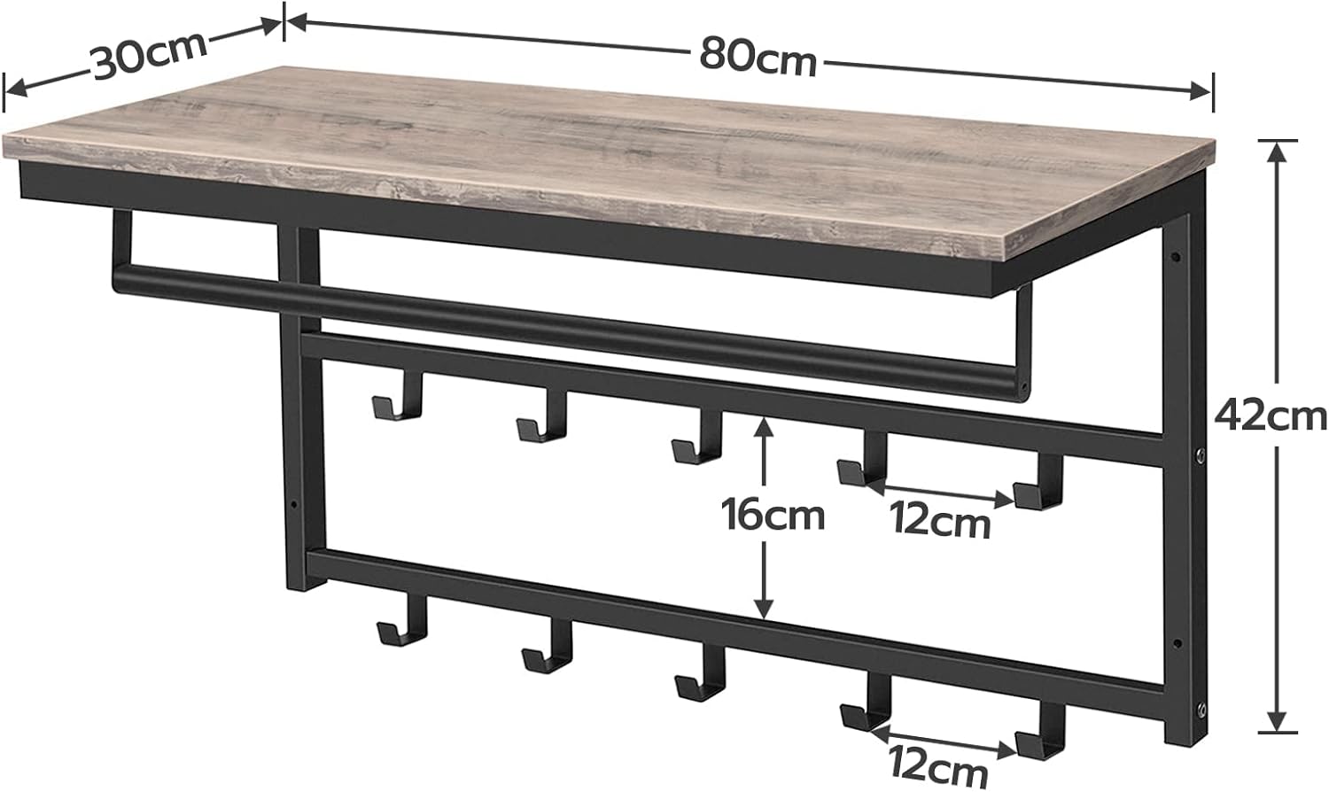 Stærk og stabil: Den stærke metalramme gør, at knagerækken holder længere, og de hårde skruer gør, at du kan fastgøre den sikkert til væggen, hylden kan bære 10 kg, stangen 10 kg og hver krog 5 kg.
